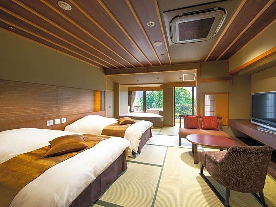 Cuando te alojes en Kaneyamaen, tu experiencia será tan única como las impresionantes vistas del monte Fuji que podrás contemplar. Imagínate relajándote en una de las elegantes habitaciones de estilo japonés, todas para no fumadores y diseñadas para una relajación total. Ya sea que observes la puesta de sol sobre las montañas desde tu terraza privada o te acurruques en una acogedora habitación con una pintoresca vista a la montaña, la paz y la tranquilidad estarán a tu alcance. Con capacidad para dos adultos y un niño, cada opción de habitación está pensada cuidadosamente para garantizar una escapada serena tanto para familias como para parejas.
